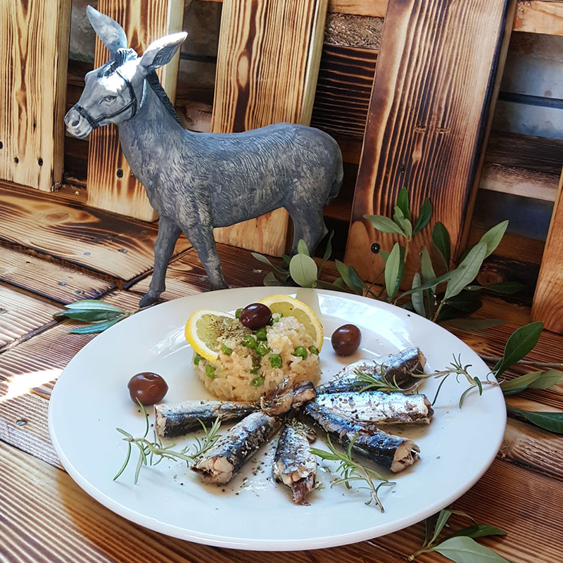 1. Skuhati rižu s graškom u vodi. Dodati začine po želji. Konzervu sardina procijediti. Sve skupa staviti na tanjur, preliti maslinovim uljem i dekorirati. Dobar tek!