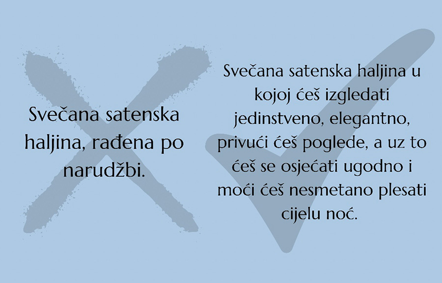 Što se tiče opisa objava, većina biznisa ističe karakteristike proizvoda, a to je pogrešno. Treba isticati benefite. U nastavku je slikoviti prikaz jednog primjera: